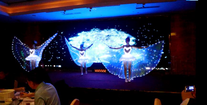 晚宴开场舞《荧光蝴蝶》。宴会厅灯光逐渐暗去,舞台上呈现亮莹莹的蝴蝶翅膀,跟随欢快的音乐节奏,幻化作翩翩起舞的荧光蝴蝶。